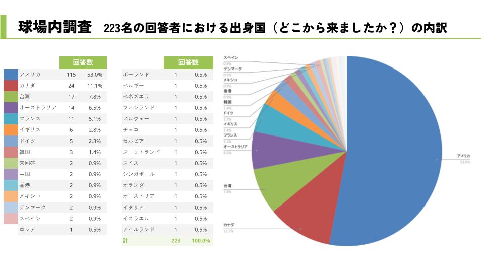 - 調査対象:東京ドームで野球観戦をしている訪日外国人(223名)