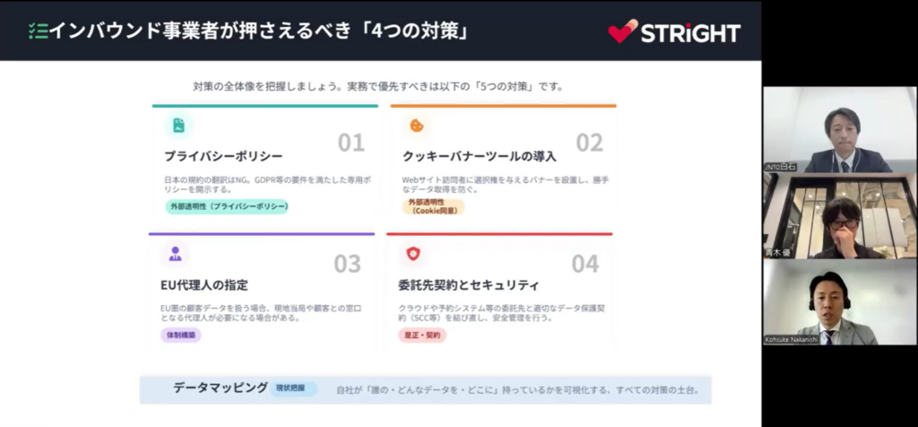 【中西】 まず取り組むべき対策は4つです。①プライバシーポリシーの整備、②クッキーバナーの設置、③EU代理人の指定、④委託先管理とセキュリティ対策。ただ、これらすべての「土台」になるのが「データマッピング」です。自社が誰のどんな個人データをどこで取得して、どこに保管しているかを把握しないと、プライバシーポリシーも正しく書けないんです。まず現状の棚卸しから始めてください。