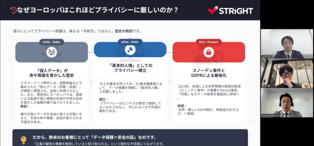 【中西】 GDPRが厳しいのはビジネス上の優位性を作るためだと思っている方も多いかもしれませんが、実はヨーロッパの歴史が深く関係しています。ナチスドイツの時代、国勢調査などで集められた宗教や民族といった個人データが迫害に利用されました。そういう反省から、EUでは個人データの保護が「基本的人権」として明確に位置づけられているんです。