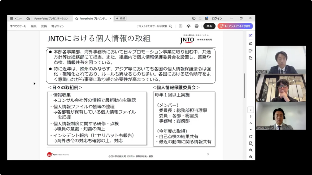 2015年にJNTOに中途入構し、バンコク事務所(2015-2019年)、総務部(2019-2023年)、シンガポール事務所(2023-2025年)を経て、2025年9月より総務部。前ポストのシンガポール事務所では、所長としてシンガポール市場における事業・プロモーションや事務所運営を統括。現在は総務グループマネージャーとして、本日のテーマである個人情報保護への対応の他、JNTOの中期計画・年度計画や内部統制、危機管理等、管理部門の業務を幅広く担当している。2025年に国家資格の中小企業診断士に登録。 |