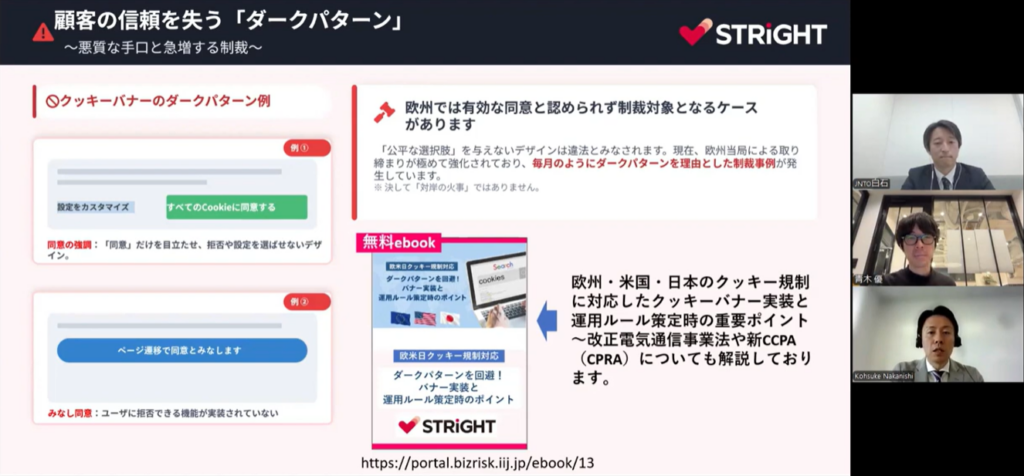 【中西】 「同意する」ボタンだけを緑色にして「拒否する」をグレーにするといった視覚的な誘導——これを「ダークパターン」と言いますが——GDPRで違法と判断されるケースが増えています。同意と拒否のボタンは同等に提示しなければならない。デザインの話なのに法律上の問題になるんです。